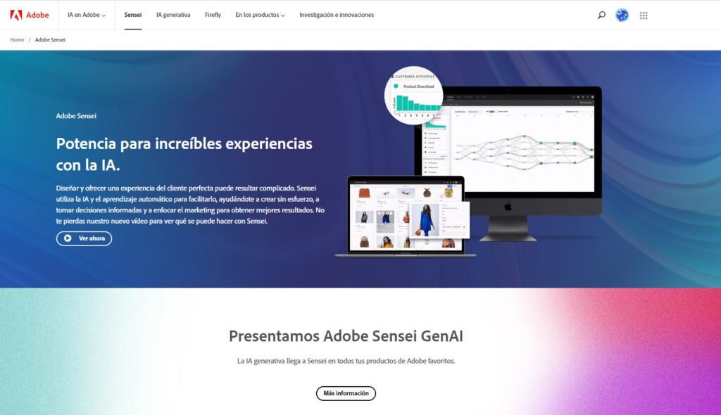 Adobe Sensei está centrada en el ámbito del marketing y la agilización de procesos manuales. Su IA permite editar fotografías y vídeos de forma ágil e intuitiva, eliminando partes de la imagen, modificándolas o extrayéndolas para su uso en diferentes soportes.