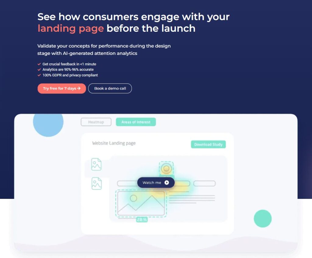 Attention Insight utiliza la IA para analizar la usabilidad de una página web, un anuncio o un packaging incluso antes de que llegue al mercado. Permite subir los diseños a la plataforma para que los analice, generando un heatmap con los puntos que generan mayor atracción visual y engagement en el usuario.