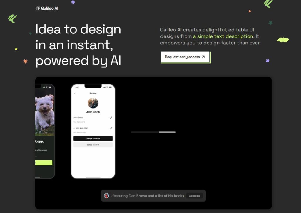 Galileo AI permite crear un prototipo de interfaz UI a partir de una única frase breve. Su base de datos incluye miles de diseños extraídos de diferentes marcas y servicios, que utiliza como referencia para ofrecer plantillas adaptadas a las necesidades de cada brief.