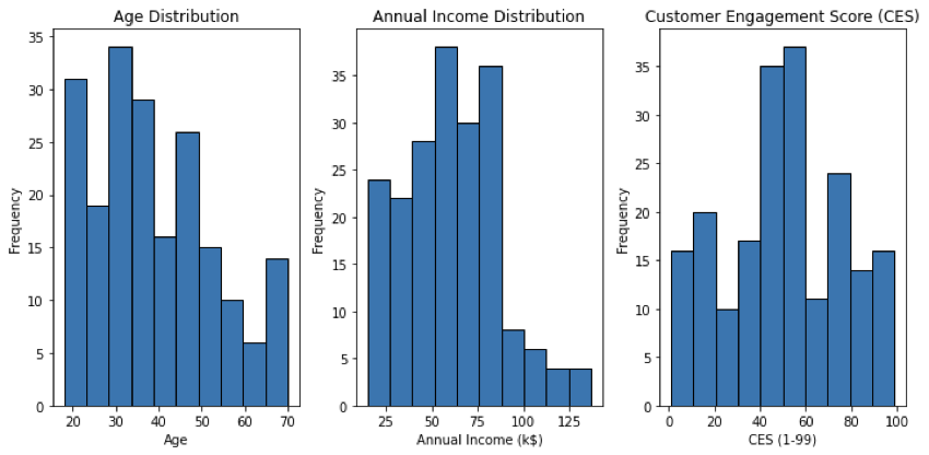 3. Por último, la variable CES. En este escenario hipotético, una puntuación CES de 1 indicaría un compromiso mínimo por parte de los usuarios, tanto en términos de gasto como de tiempo invertido en la aplicación, mientras que una puntuación CES de 99 indicaría un compromiso extremadamente alto por parte de los usuarios, tanto en términos de gasto como de tiempo invertido en la aplicación. Observamos que la media de esta variable es de 50,2 y la desviación típica es de 25,8, por lo que se aproxima más a una distribución normal que la edad y los ingresos anuales.