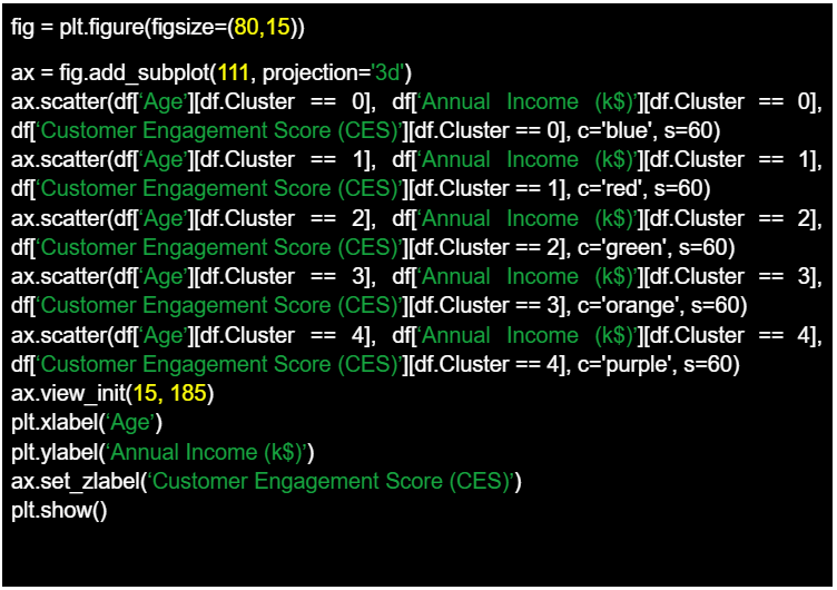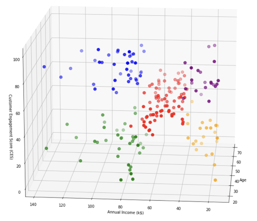 Utilizando de nuevo la biblioteca Matplotlib llegamos al final de nuestro ejercicio, generando un gráfico de dispersión en 3D para visualizar los resultados de un análisis de agrupamiento. El código procede a dibujar cada caso individual en el espacio 3D. Cada comando de diagrama de dispersión representa un cluster diferente, donde los casos individuales que pertenecen a un cluster específico se seleccionan utilizando indexación condicional. Los casos se sitúan en el espacio en función de sus atributos «Edad», «Ingresos anuales (k$)» y «Puntuación de compromiso del cliente (CES)» del DataFrame df. A cada grupo se le asigna un color diferente. La función view_init() se utiliza para establecer el ángulo de visión del gráfico 3D, especificando un ángulo de elevación de 15 y un ángulo de acimut de 185. Las etiquetas de los ejes se establecen para el eje X (Edad), el eje Y (Ingresos anuales (k$)) y el eje Z (Puntuación de compromiso del cliente (CES)).