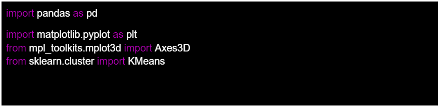 En cuanto a la biblioteca Matplotlib, tomamos el subpaquete mpl_toolkits.mplot3d para importar el módulo Axes3D, que proporciona herramientas para crear gráficos y visualizaciones en 3D. De Sckit-learn importaremos el algoritmo KMeans.