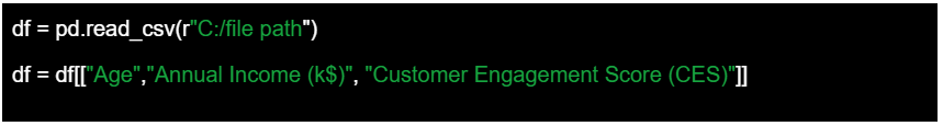 El siguiente paso es utilizar la función pandas para leer el archivo CSV que contiene nuestro conjunto de datos. Llamaremos al conjunto de datos df, como abreviatura de DataFrame. En el contexto de la biblioteca pandas de Python, un DataFrame es una estructura de datos bidimensional etiquetada. Cada columna en un DataFrame representa una variable o una característica, mientras que cada fila representa una observación o una entrada. Una vez cargado el DataFrame, conservaremos las 200 entradas, pero seleccionaremos sólo las columnas que contienen variables numéricas continuas, que el algoritmo K-means utilizará para agrupar a los usuarios. Dado que el sexo es una variable categórica, la descartamos temporalmente de nuestro análisis.