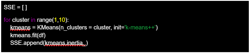 El algoritmo asigna iterativamente los casos individuales a los clusters y ajusta sus centroides para minimizar la variación dentro del cada cluster. La inercia, que es la suma de las distancias al cuadrado entre cada caso individual y su centroide más cercano, se calcula utilizando el atributo ‘kmeans.inertia_’. Este valor se añade a la lista SSE, representando la calidad de la agrupación para el número actual de clusters.