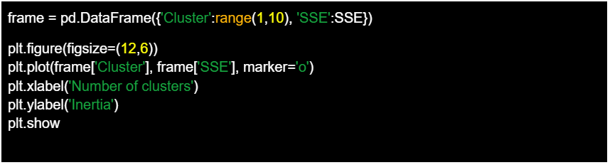 Una vez completado el bucle, los valores de SSE se organizan en un DataFrame de Pandas llamado ‘frame’, donde cada fila corresponde a un número de clusters específico y su correspondiente valor de SSE. Este DataFrame se utiliza entonces para visualizar la relación entre el número de clústeres y la inercia.