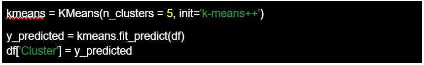 Por último, configuramos el algoritmo K-means estableciendo el parámetro ‘n_clusters’ en 5. A continuación, aplicamos el algoritmo a los datos de ‘df’. El método fit_predict() ajusta el modelo KMeans a los datos, asignando cada caso individual del df a uno de los clusters. Las asignaciones de clusters para cada caso individual se almacenan en la variable y_predicted. En el último paso, añadimos una nueva columna llamada ‘Cluster’ al DataFrame df y asignamos los valores de y_predicted a esta columna. Cada valor representa el cluster al que ha sido asignado cada caso individual del df.